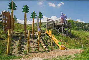 Quer durch das Zentrum verläuft ein Spielepfad, wo immer wieder neue, hochwertige Holz Spielgeräte zu finden sind, z.B. die Ringelnatter zum Balancieren, ein Klettergerüst, ein Waldtelefon und vieles mehr!